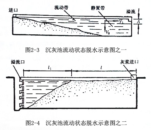 灰水流動狀態(tài)的脫水是灰水由沉灰池的一端進入,澄清水由另一端溢流排出的連續(xù)作業(yè),灰粒在灰水流中邊流動邊沉降。在沉灰池中灰水分為兩帶,上層灰水流動部分稱為流動帶,下層靜止沉降積灰部分稱為靜置帶(圖2-3和圖2-4)。沉灰池中粗、重顆粒,由于水力沉速快,穿過運動帶的時間很短,被灰水流攜帶向溢流口移動的距離也很短,故在沉灰池進口處快速沉降,而形成一個坡向溢流口的斜面?;宜粩嘁M,澄清水溢流,斜面積灰層逐漸增高,待溢流水中含灰量超過允許限度(<0.1)時就關(guān)閉灰水進口閘門,再靜置一段時間后,入出澄清水就可以挖灰使用。