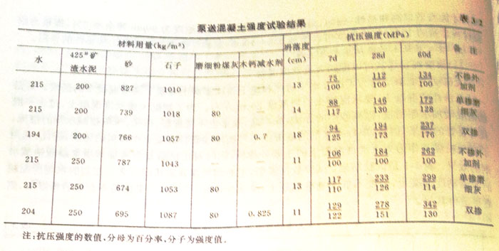 可泵性主要決定于混凝土與管壁之間的摩擦力。由于低標(biāo)號(hào)混凝土的水泥用量少,可泵性差,因此,過去規(guī)定C15以下的混凝土不得泵送。可是摻如粉煤灰和減水機(jī)劑后,可使混凝土在不增加水泥的情況下仍能獲得良好的可泵性。在寶電工程中,C2.5、C5和C15的混凝土在300m水平硬管輸送時(shí)也沒有發(fā)生堵塞現(xiàn)在。表3—3是低標(biāo)號(hào)粉煤灰泵送混凝土的施工實(shí)例。