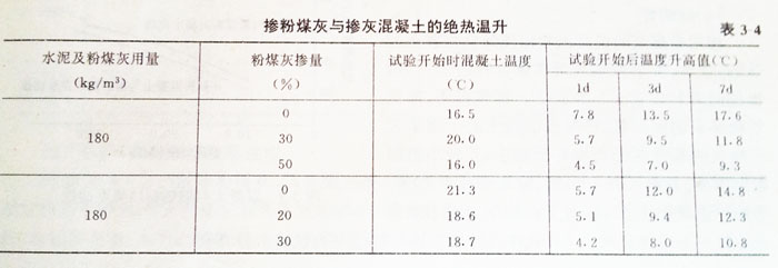 在大體積混凝土中,使用普通硅酸鹽水泥,由于水泥水化時(shí)硅酸三鈣(C3S)和鋁酸三鈣(C3A)作用發(fā)生熱量,Ig硅酸鹽水泥的總放熱量可達(dá)502J,因而導(dǎo)致混凝土溫度升高以至溫差收縮引起的裂縫。在普通混凝土中摻入粉煤灰后,水化熱明顯降低。表3—4是混凝土溫升狀況。由表列數(shù)據(jù)可知,摻30%粉煤灰與不摻粉煤灰的混凝土相比,絕熱溫升低27%~33%,較高溫升降低30%,并且可以減少或完全不需要人工冷卻措施。